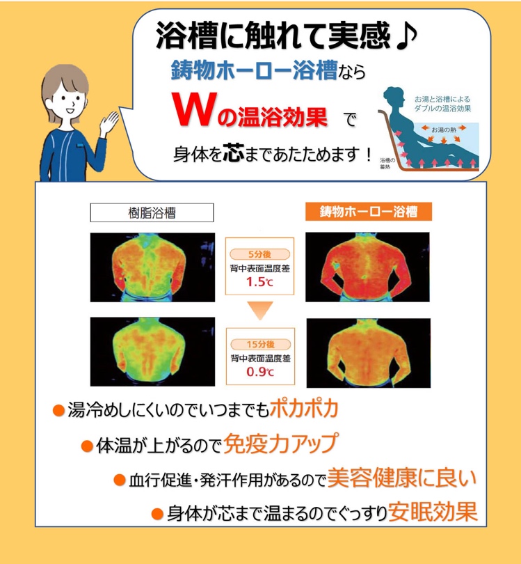 お湯が冷めにくく、深部体温をじっくりと温めます。